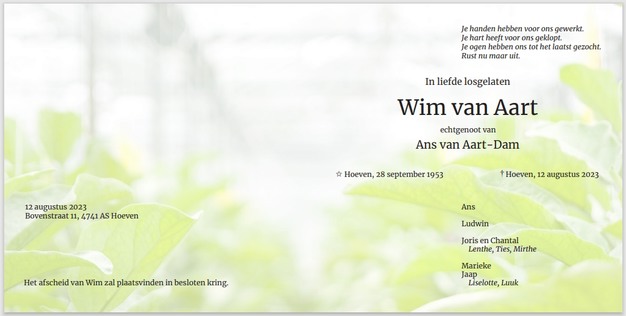 Op zaterdag 12 augustus is Wim van Aart overleden. "Mijn vader was één van de pioniers toen hij in 1991 begon met het biologisch telen onder glas. Tot 5 maanden voor hij overleed was hij werkzaam op onze biologische tuinderij, winkel en webwinkel De Heulhoeve in Hoeven", vertelt Joris van Aart.