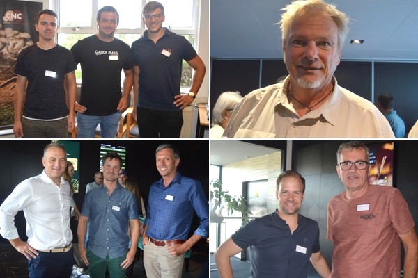 Deelnemers aan de HLP-Dag. Met de klok mee: het team van Kirnig uit Zuid-Tirol, Torsten Jonas uit Pilzgarten, de vertegenwoordiging van Hermann.Bio uit Oostenrijk en het management van Kernser Edelpilze met Kasper Moreaux (Mycelia).