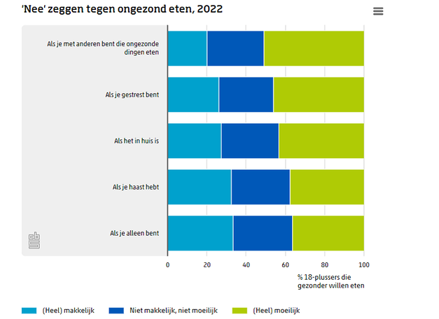 Mensen die gezonder willen eten, vinden het vooral moeilijk om ‘nee’ te zeggen tegen ongezond eten als zij met anderen zijn die ongezonde dingen eten. Ruim de helft geeft dit aan. Ongezond eten laten staan bij stress vindt 46 procent moeilijk en 43 procent vindt het lastig als er ongezond eten in huis is. Haast hebben of alleen thuis zijn worden elk door ongeveer een derde genoemd.