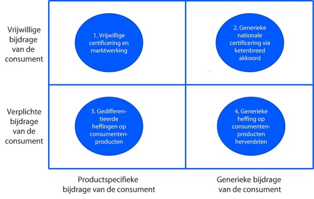 We zitten in een spagaat. De wens om te groeien naar een duurzaam voedselsysteem gaat (nog) niet samen met de bereidheid vanuit de markt om meer te betalen voor duurzame producten. Dit blijkt ook uit onze pas gepubliceerde studie. Daarin staat een uitgebreide analyse over of de consument bereid is een meerprijs te betalen voor een duurzamer geproduceerd product. We onderscheiden hierin vier modellen, met als uitgangspunten of een consument vrijwillig meedoet of verplicht wordt te betalen. En of die heffing productspecifiek of generiek betaald moet worden: