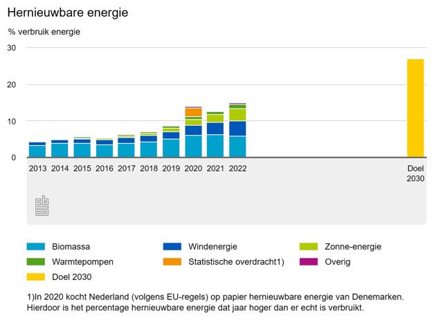 Het percentage hernieuwbare energie in Nederland steeg van 9 in 2019 naar 15 in 2022. De doelstelling van Nederland is dat 27 procent van het energieverbruik in 2030 uit hernieuwbare bronnen komt, zoals biomassa, zon en wind. De doelstelling hangt samen met de Europese Green Deal, die precies vier jaar geleden door de Europese Commissie werd gepresenteerd. Dit meldt het CBS.