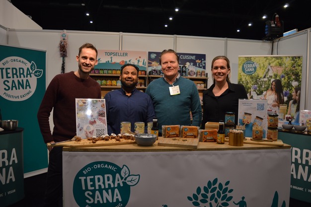 Remko Hartveldt, Saoed Ramdjan, Boudewijn van der Kroft en Belinda Barnhard in de TerraSana-stand op de Biobeurs.