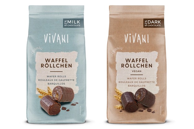 Met de nieuwe Wafer Rolls doet Vivani voor het eerst zijn intrede in het koekjesassortiment. De chocoladebiscuitjes zijn verkrijgbaar in de versies 'pure chocolade' en 'melkchocolade' en zijn bedekt met een dikke laag biologische Vivani-chocolade (52% chocolade). Dit is een gloednieuwe productcategorie voor Vivani.
