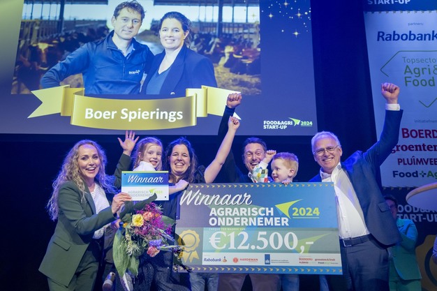 Jasper en Afke Baukje Spierings uit Oss zijn woensdag 27 maart uitgeroepen tot Agrarisch Ondernemer van het Jaar 2024. De ondernemers ontvingen de prestigieuze prijs uit handen van minister Piet Adema van Landbouw, Natuur en Voedselkwaliteit. Aan de prijs is een cheque verbonden van €12.500. De Time Travelling Milkman is verkozen tot de Beste Food&Agri Start-up 2024. Dit betekent dat zowel biologisch melkveehouder Peter Oosterhof als biologische melkveehouders Joost, Liesbeth en Simon Samson buiten de prijzen zijn gevallen. En dit geldt ook voor Trabotyx (start-up).
