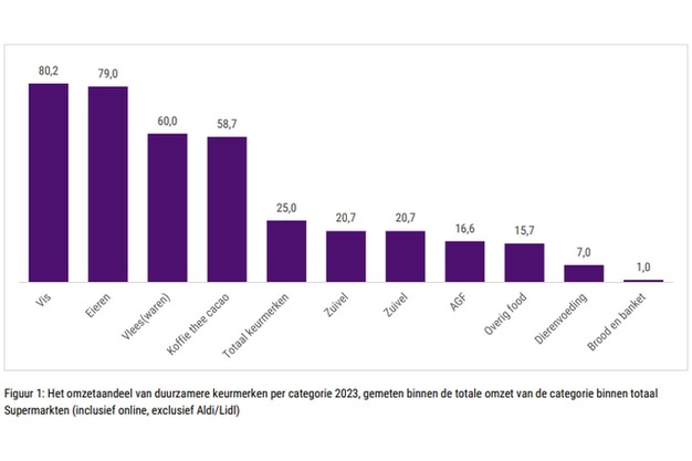 Vis wordt met 80,2% het meest mét keurmerk gekocht (ASC en MSC), daarna eieren met 79% (biologisch, vrije uitloop of scharrel) en vlees(waren) staan door de sterke groei van kip op de derde plek met 60%.