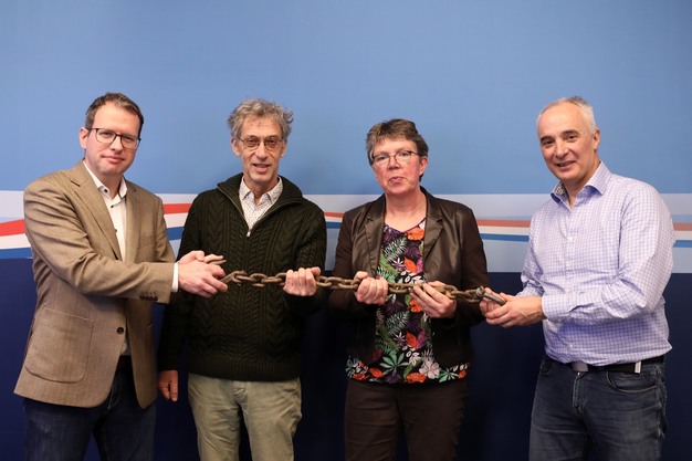 André Hoogendijk (BO Akkerbouw), Henk Klompe (Bionext), Tineke de Vries (LTO Nederland) en Geert Kessel (WUR). De keten symboliseert de ketenaanpak. Deze foto is gemaakt tijdens de bijeenkomst van het Taskforce Phytophthora van BO Akkerbouw in perscentrum Nieuwspoort in Den Haag. Foto: VidiPhoto.