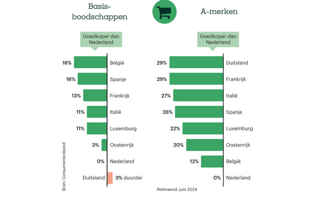 België is het goedkoopst voor basisboodschappen zoals koffie, thee, pasta en rijst. Consumenten betalen daar gemiddeld 18% minder dan in Nederland. A-merken zijn het goedkoopst in Duitsland en Frankrijk, gemiddeld 29% goedkoper dan in Nederland.