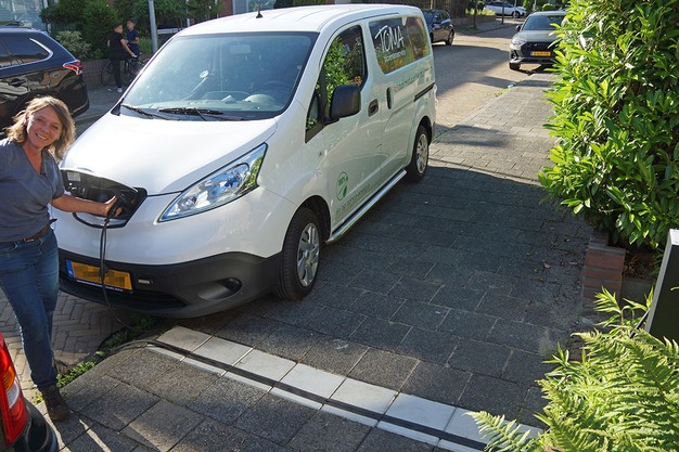 Voor bloemiste Toma Smit (van TOMA Bloemenservice) in Hilversum is de zon gaan schijnen. Ze woont in een straat met rijtjeshuizen en kan in haar tuin hooguit een elektrische bakfiets kwijt. Die gebruikte ze tot voor kort voor het rondbrengen van boeketten op abonnement, met vaas en al. Maar haar bedrijf groeit groter. Sinds begin 2024 heeft ze een tweedehands elektrische Nissan bestelbus én heeft ze een kabelgoot over het trottoir voor het huis gekregen. In die goot past haar oplaadsnoer. Dat is een veel elegantere oplossing dan een matje over een oplaadkabel die over het trottoir loopt of een bovenmaatse zwenk-arm die de kabel over de hoofden van de voetganger tilt. Het komt er nu alleen nog op aan dat Toma haar wagen voor de deur kan parkeren. En dat de zon blijft schijnen.