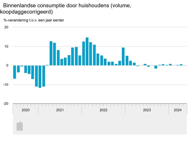 Consumenten hebben 3,4 procent meer duurzame goederen aangeschaft dan in mei 2023. Ze kochten onder andere meer kleding, elektrische apparaten, schoenen en spullen voor de woning. Huishoudens schaften echter veel minder auto's aan. Verder hebben huishoudens in mei 1,9 procent minder besteed, voor prijsveranderingen gecorrigeerd, aan voedings- en genotmiddelen dan in mei 2023. Ze verbruikten ook 5,4 procent minder overige goederen, zoals energie en motorbrandstoffen. Mei was minder koud dan mei vorig jaar.