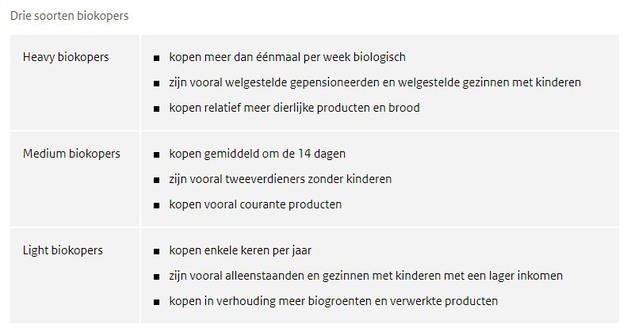 In België vertegenwoordigen de 'heavy buyers' 20% van de kopers, maar zij zijn goed voor 81% van de totale biologische bestedingen. De medium biokopers zorgen voor 15% van de bio-omzet, terwijl de light biokopers 4% bijdragen.