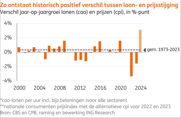 De gemiddelde loonstijging voor 2024 (6,6%) toornt ruimschoots uit boven de gemiddelde prijsstijging (3,4%) uit, volgens de meest recente cijfers van het Centraal Planbureau (CPB). We moeten zelfs bijna een halve eeuw terug (naar 1977) voor een vergelijkbaar positief verschil tussen loonstijging en inflatie. Tegelijkertijd heeft deze historische statistiek natuurlijk ook een keerzijde: de afgelopen paar jaar waren de rollen nog omgedraaid, met 2022 als historisch dieptepunt.