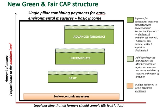 Thomas Fertl, bestuurslid van IFOAM Organics Europe en vertegenwoordiger van de landbouwsector, lichtte de aanpak toe: "Wij stellen een driefasenaanpak voor om te zorgen voor evenredigheid tussen het niveau van de milieuambities van een landbouwbedrijf en de financiering die het ontvangt, gebaseerd op sleutelgebieden: bodembescherming, impact op water, klimaat en biodiversiteit. Dit zou hoge milieuambities en een coherente aanpak op bedrijfsniveau mogelijk maken en tegelijkertijd de administratie voor landbouwers en nationale autoriteiten vergemakkelijken. In onze visie komen twee doelstellingen samen: Het belonen van boeren die al bezig zijn met duurzame productiemethoden en het ondersteunen van andere boeren in een geleidelijke overgang naar agroecologie."