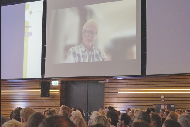 Prof. dr. Martin van den Berg te zien, die vanuit een online verbinding meepraatte vanuit Kopenhagen.