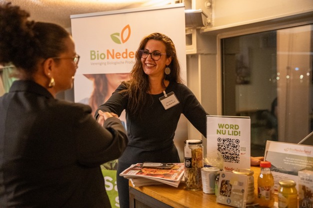 Elise Bijkerk en Saliha Elhamdi verzorgden de tafelpresentatie van BioNederland. Elise Bijkerk, directeur Marktontwikkeling: "BioNederland werkt, samen met haar leden, aan een ambitieus plan om biologisch relevanter te maken voor consumenten en retailers. De uiteindelijke doelstelling is te groeien naar 15% marktaandeel in 2030. Een ambitieus doel dus, dat vraagt om samenwerking en daadkracht. We zoeken hier dan ook nadrukkelijk het contact met leden, potentiële leden en consumenten."