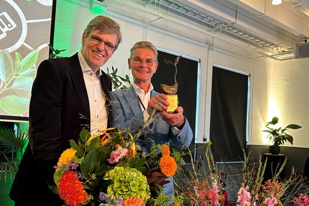 De Plantum Duurzaamheidsprijs werd door Dick Veerman (links) uitgereikt aan Foeke Gardeniers van Dümmen Orange.