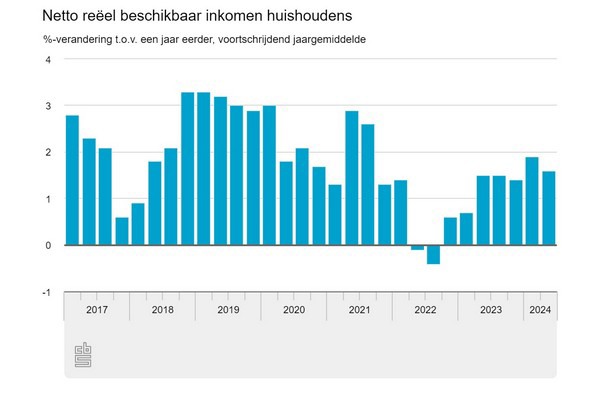 Het reëel beschikbaar inkomen van huishoudens was in het tweede kwartaal van dit jaar 1,6 procent hoger dan een jaar eerder. De toename is vooral toe te schrijven aan een stijging van de beloning van werknemers, door hogere cao-lonen. De hypotheekschuld groeide met 9,2 miljard euro ten opzichte van een kwartaal eerder, naar 870,7 miljard euro. Dit meldt het CBS op basis van nieuwe cijfers over de financiën van huishoudens.