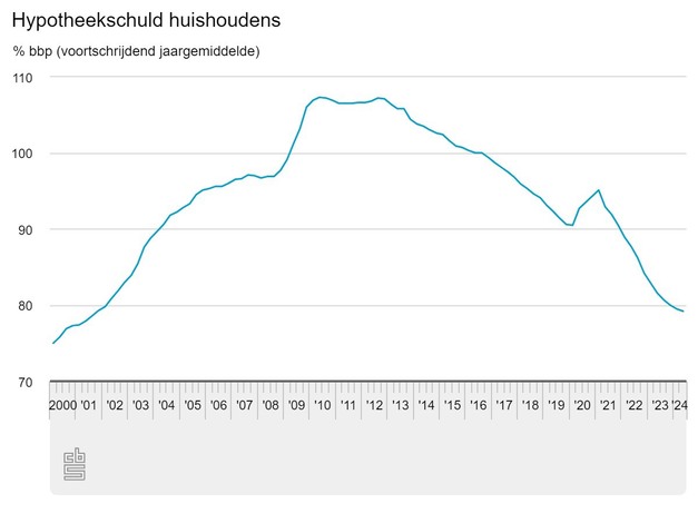 In het tweede kwartaal van 2024 nam de woninghypotheekschuld toe met 9,2 miljard euro vergeleken met een kwartaal eerder. De hypotheekschuld loopt sterker op dan vorig jaar doordat de huizenprijzen in het tweede kwartaal hoger lagen dan een jaar eerder en er meer woningen werden verkocht. Doordat de economie nominaal harder groeide, nam de hypotheekschuld als percentage van het bbp af; van 79,5 procent in het eerste kwartaal naar 79,2 procent in het tweede kwartaal van 2024. Dit is het laagste niveau na het derde kwartaal van 2001.