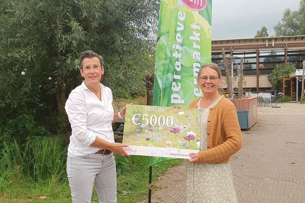 Merle Koomans van den Dries, directeur van Odin, geeft een cheque van €5.000 aan Tineke van den Berg van Stadsboerderij Almere.
