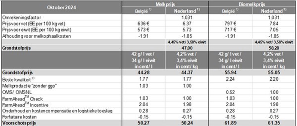 De voorschotsprijzen gelden voor melkleveringen met 4,45% vet en 3,58% eiwit en zijn inclusief de toeslagen voor kwaliteit, logistiek, de Klimaatcheck, de duurzaamheidstoeslag van Arla Foods en ggo-vrije melkproductie. De prijzen zijn exclusief de verwachte nabetaling (incl. rente) en de consolidering.