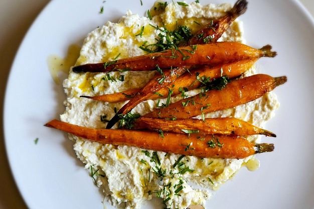 Geroosterde wortel met pijnboompitten pasta en opgeklopte feta