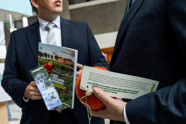 Meer dan honderdduizend ondertekenaars willen minder stikstofuitstoot en een omslag naar ecologische landbouw. Dinsdag 8 oktober bood Greenpeace-directeur Andy Palmen een petitie van deze strekking aan, aan leden van de Kamercommissie Landbouw, Visserij, Voedselzekerheid en Natuur. Bij de overhandiging werd symbolisch een kratje biologische groente en fruit meegenomen en uitgedeeld aan leden. Als de stikstofuitstoot niet uiterlijk eind 2025 drastisch omlaag gaat, raken natuursoorten als veengebieden, oude eikenbossen en zandverstuivingen mogelijk onherstelbaar beschadigd of kunnen zelfs verdwijnen. Greenpeace startte daarom een rechtszaak, waarvan de zitting gepland staat op 12 november bij de rechtbank in Den Haag.