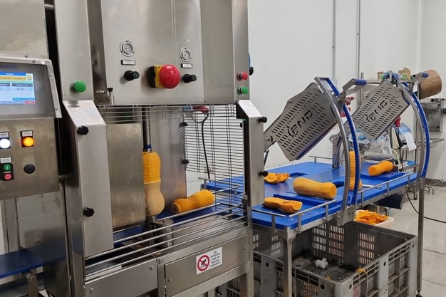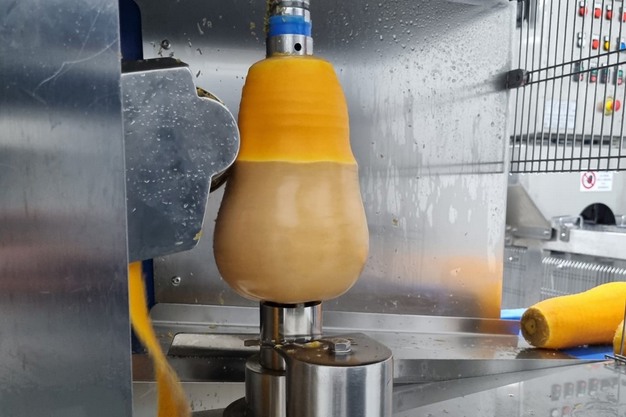 "Het is een gebruiksvriendelijke lijn die ook eenvoudig te onderhouden is", vervolgt Cascella. "De groente wordt met instelbare snelheid geschild. De machine is gemaakt van voedselveilig roestvrij staal en is uitgerust met een touchscreen waar de rotatiesnelheid van de groente en de schilsnelheid van het mes kunnen worden ingesteld, twee transportbanden (voor de geschilde groente en voor het afval) en een inspectietafel. Het schilproces kan vervolgens worden voltooid met snijden: de schiller kan worden gecombineerd met een snijeenheid die de pompoen in tweeën snijdt."