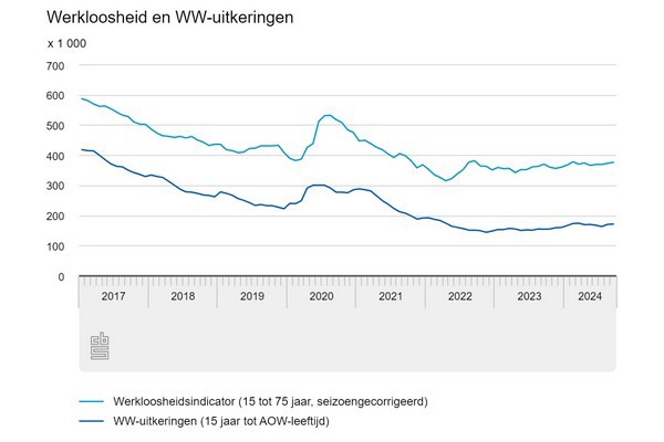 In september 2024 waren er 377 duizend werklozen. In de afgelopen drie maanden kwamen er gemiddeld 2 duizend per maand bij. Net als in augustus was het werkloosheidspercentage 3,7. Het aantal mensen met betaald werk daalde de afgelopen drie maanden met gemiddeld 13 duizend per maand en bedroeg 9,8 miljoen in september. Dit meldt het CBS op basis van nieuwe cijfers. UWV registreerde eind september 172 duizend lopende WW-uitkeringen.