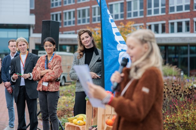 Sophie Veeman, 12 jaar, had ook een duidelijke boodschap. Zij verheugt zich op gewoon mooie boerderijen met overal waar je kijkt bloeiende bloemen, bijen, lieveheersbeestjes, egels en schone sloten vol met leven. Ook ziet zij graag dat dieren zoals koeien, varkens en kippen veel buiten kunnen zijn. "Was biologisch maar gewoon. Helaas is maar één op de twintig boerderijen in Nederland biologisch. De meeste kinderen weten ook niet wat het verschil is.' Vandaag is Sophie met andere kinderen op traptrekkers gekomen om dit op te lossen. 'Soms lijken dingen heel moeilijk en ingewikkeld, maar het is gewoon een kwestie van doen. Lidl, jullie snappen het! Jullie gaan ervoor en maken bio gewoon. Dankzij jullie gaan heel veel niet zo biologische vaders en moeders voortaan gewoon biologische wortels kopen. Andere kinderen eten dan ook gewoon lekker bio. Hartjes voor jullie van mij en andere kinderen."