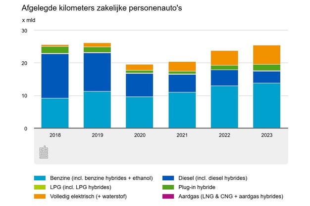 Zakelijke rijders legden in 2023 in totaal ruim 25,5 miljard autokilometers af, gemiddeld 20,5 duizend kilometer per auto. Terwijl de dieselkilometers terugliepen, namen de kilometers afgelegd op elektriciteit juist toe. In 2018 werden de meeste zakelijke kilometers nog gereden met een dieselauto: ruim 13,6 miljard. Vijf jaar later was dat met drie kwart gedaald. Het aantal elektrische kilometers vertienvoudigde tegelijkertijd. Gemiddeld rijdt de zakelijke rijder 20,3 duizend kilometer in een elektrische auto tegen 24,8 duizend met een diesel.