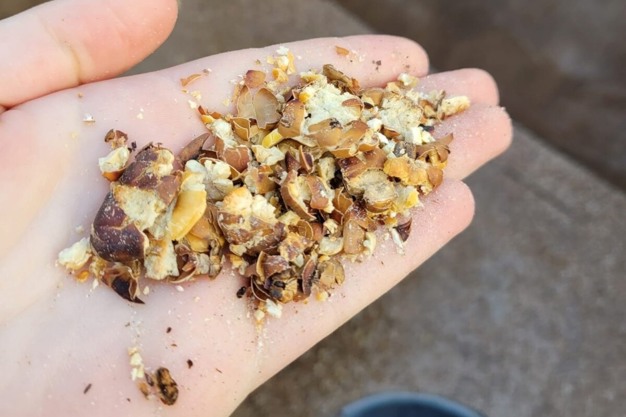 In een open schuur op het erf van het Hof van Geervliet staat inmiddels zo'n 'bonenroostermachine', die draait op zonne-energie. "We hebben een voorraadbunker die de machine constant voedt", zegt Cees. "De machine bestaat uit een vijzel, omringd door verwarmingselementen. Daarachter zit een pletter die de veldbonen breekt." Het ruikt een beetje naar popcorn in de schuur. 'We voeren het vooral aan de kalfjes, en die eten het graag', lacht Cees. "De kalfjes hebben de meeste eiwitaanvulling nodig om goed te groeien. We gebruiken nu geroosterde veldbonen in plaats van krachtvoer."