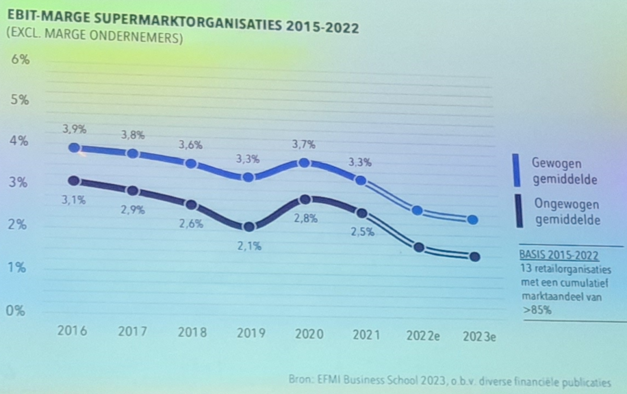 Kijkend naar de ontwikkeling van de EBIT-marge van supermarktorganisaties, ziet EFMI dat deze de afgelopen jaren sterk zijn afgenomen, van een ongewogen gemiddelde van 3,1% naar 1,5%. "Winstgevendheid van supermarkten staat stevig onder druk en is onvoldoende om investeringen te kunnen doen", zei hij. AGF zorgde altijd voor goede marges voor supermarkten, maar ook daar ziet Sloot de laatste jaren een afname in winstgevendheid door hevige concurrentie van met name Lidl die met een klein assortiment, hoge omloopsnelheid en lage prijzen van AGF een zeer sterke concurrent is geworden.