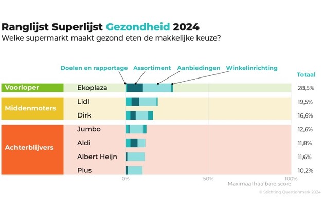 Met name de inzet van Ekoplaza op het aanbieden van een gezond assortiment maakt dat Ekoplaza wederom voorop loopt, op afstand gevolgd door Lidl en Dirk. Jumbo, Aldi, Albert Heijn en Plus blijven achter. 72% van de Nederlanders vindt het volgens Questionmark belangrijk dat supermarkten hun klanten stimuleren om een gezonde keuze te maken. De Superlijst Gezondheid 2024 beoordeelt supermarkten op vier domeinen: beleidsdoelen, assortiment, aanbiedingen en winkelinrichting. Ekoplaza onderscheidt zich met een assortiment dat binnen de onderzochte productgroepen voor 50% binnen de Schijf van Vijf valt en de keuze voor dit systeem boven de Nutri-Score. Ook loopt Ekoplaza net als twee jaar geleden voorop in zout- en suikerreductie.