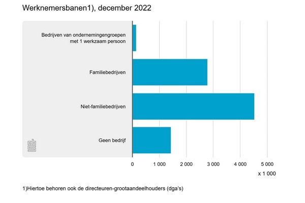 Familiebedrijven zorgden voor bijna 2,8 miljoen werknemersbanen in 2022, dat is ruim 31 procent van het totaal aantal werknemersbanen. Bedrijven en instellingen die niet in familie-eigendom waren, telden ruim 4,5 miljoen werknemersbanen. De overige werknemersbanen zijn banen bij instellingen zoals overheids- en onderwijsinstellingen (1,43 miljoen) en bij ondernemingen met 1 werkzaam persoon (158.000).