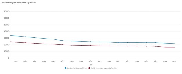 Vlaanderen telt in 2023 in totaal 21.759 landbouwbedrijven, waarvan 75% met beroepsmatig karakter (standaard output of SO van minstens 25.000 euro). Het aantal landbouwbedrijven is ten opzichte van 2013 met bijna 13% teruggelopen, een daling van gemiddeld 1,3% per jaar.