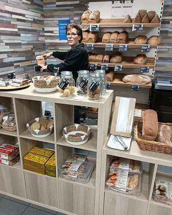 Twee jaar geleden heeft Het Natuurhoekje zich aangesloten bij G&W Gezondheidswinkel. Sindsdien is het een natuurdrogisterij en hebben ze keuzes moeten maken in het aanbod. Kim: "De fysieke broodafdeling verdween, maar klanten konden nog steeds brood bij ons kopen. Klanten gaven regelmatig aan dat ze het jammer vonden dat de broodafdeling weg was. Ook kregen we in de loop van de tijd steeds meer vraag naar ongesneden brood. En mede door de sluiting van Ekoplaza Roermond steeg de vraag naar brood zodanig, dat we besloten hebben om weer een broodafdeling in te gaan richten. Hier is Marlies het afgelopen weekend mee aan de slag gegaan en dit is prima gelukt."