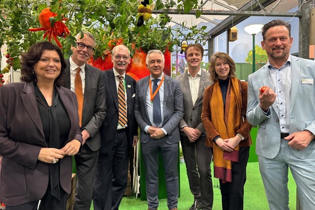 v.l.n.r Anneke van de Kamp (Topsector Tuinbouw & Uitgangsmaterialen), Jan-Kees Goet (secretaris-generaal LVVN), Jean Rummenie (staatssecretaris LVVN), Richard Schouten (GroentenFruit Huis), Michiel Klompenhouwer (Plantum), Hester Somsen (ambassadeur in Duitsland), Ruud Paauwe (Glastuinbouw Nederland)