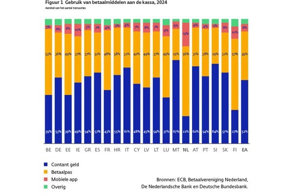 Digitale betalingen zijn in het eurogebied in opmars, maar contant geld is in 2024 nog steeds het meest gebruikte betaalmiddel aan de kassa. Meer dan de helft (52%) van alle betalingen werd in 2024 contant afgerekend. In Nederland ligt dat met ongeveer één op de vijf aanmerkelijk lager. Dit blijkt uit een grootschalig, tweejaarlijks onderzoek van de Europese Centrale Bank (ECB) naar het betaalgedrag in het eurogebied.