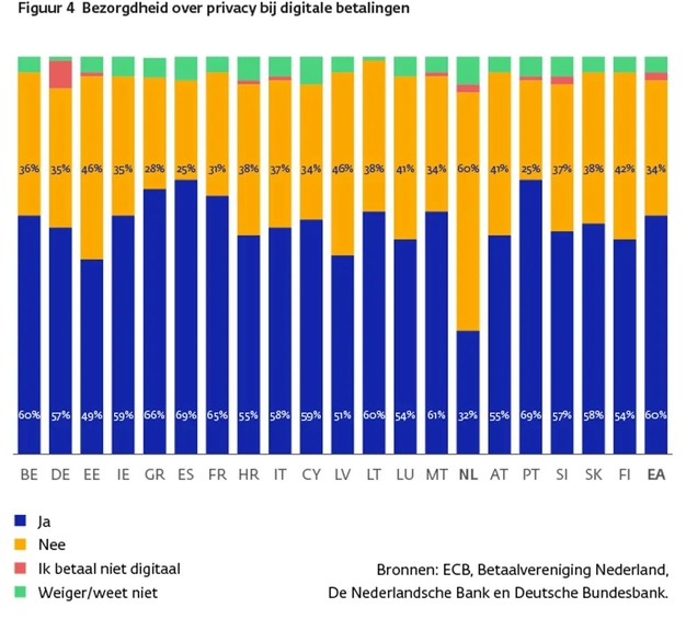 Dit jaar heeft de ECB voor het eerst gevraagd naar de bezorgdheid over privacy bij digitale betalingen. Digitale betalingen zijn online betalingen of betalingen aan de kassa met de pinpas of mobiele telefoon. Drie op de vijf inwoners van eurolanden geven aan dat zij zich wel eens zorgen maken of hun privacy wordt gewaarborgd bij digitale betalingen. Nederlanders maken zich hier het minst druk over: 32% geeft aan bezorgd te zijn over de privacy bij digitale betalingen.