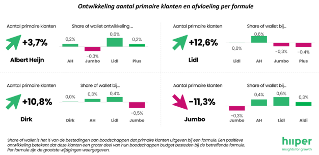 Joep Smeets, Managing Director Hiiper stelt: "Het was een turbulent jaar voor supermarkten, veel verschuivingen en duidelijke winnaars en verliezers. Door de ban op tabaksverkoop zien we dat consumenten in beweging zijn gekomen. Lidl, Dirk en AH zijn de winnaars in 2024 en profiteren bovengemiddeld van malheur bij Jumbo. Alle drie weten ze daarbij flink te groeien in aantal primaire klanten. En alle drie snoepen ze daarbij omzet af van Jumbo. Als het 4e kwartaal een voorbode is voor 2025, dan zullen we Aldi en Lidl sterk door zien stijgen dit jaar. Met hoeveel? Dat zal er van afhangen of Jumbo de stabilisatie van de afgelopen tijd weet om te buigen naar groei in de komende kwartalen."
