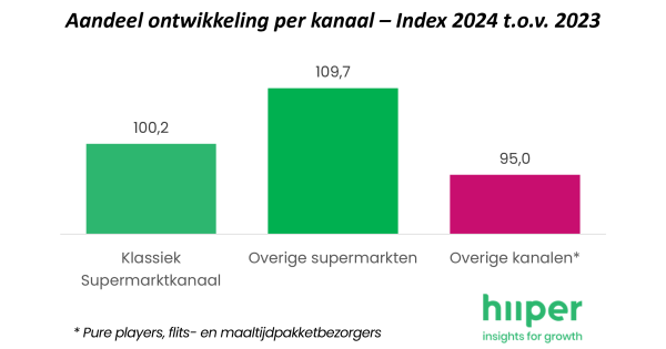 Afgelopen jaren hebben we gezien dat consumenten steeds vaker kiezen voor andere kanalen. In 2024 lekt er echter geen omzet meer weg uit de klassiekere marktdefinitie. Het segment 'overige supermarkten', waaronder Ekoplaza, Amazing Oriental en Sahan wint wel flink terrein. Dit gaat qua aandeel ten koste van de online kanalen.