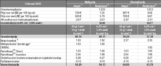 De voorschotsprijzen gelden voor melkleveringen met 4,45% vet en 3,58% eiwit en zijn inclusief de toeslagen voor kwaliteit, logistiek, de Klimaatcheck, de duurzaamheidstoeslag van Arla Foods en ggo-vrije melkproductie. De prijzen zijn exclusief de verwachte nabetaling (incl. rente) en de consolidering.