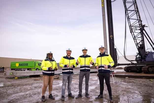 Medewerkers van Bakker Barendrecht slaan eerste paal voor nieuwbouw op Dutch Fresh Port in Ridderkerk.
