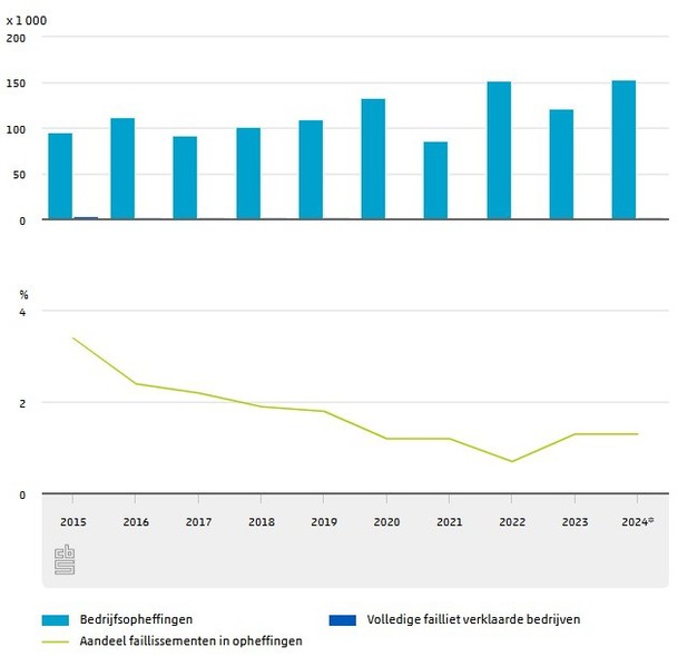 Slechts een klein deel van de bedrijven is opgeheven vanwege een faillissement. De grote meerderheid van de opgeheven bedrijven stopt vrijwillig. In 2024 werden bijna 2 duizend bedrijven volledig failliet verklaard en opgeheven, 28 procent meer dan in 2023. Een bedrijf kan ook deels failliet verklaard worden als niet alle juridische onderdelen failliet gaan. In 2024 werden 1,3 duizend bedrijven deels failliet verklaard en daarmee niet opgeheven. Het aandeel van de volledig failliet verklaarde bedrijven in de bedrijfsopheffingen daalde van 3,4 procent in 2015 naar ruim onder de 1 procent in 2022. Sindsdien is het aandeel weer iets gestegen naar 1,3 procent.