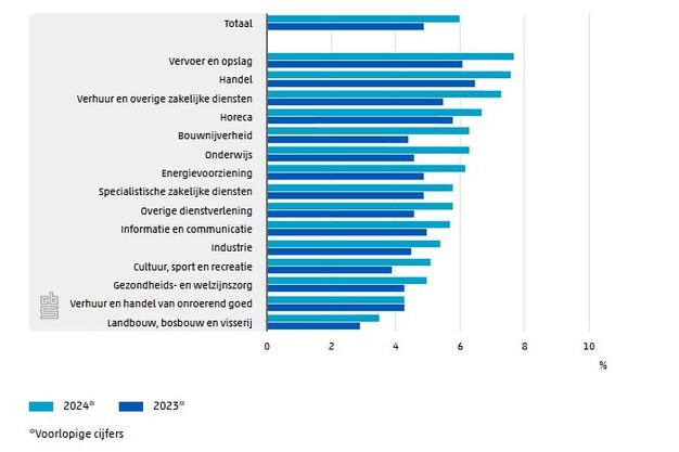 In de bedrijfstak vervoer en opslag (7,7 procent) en de handel (7,6) werden in verhouding tot hun totaal de meeste bedrijven opgeheven. Met uitzondering van de verhuur en handel van onroerende goed nam de opheffingsgraad in alle bedrijfstakken toe ten opzichte van 2023. Die toename was het grootst in de bouwnijverheid, waar de opheffingsgraad steeg van 4,4 procent in 2023 naar 6,3 procent in 2024. De landbouw, bosbouw en visserij kende met 3,5 procent de laagste opheffingsgraad.