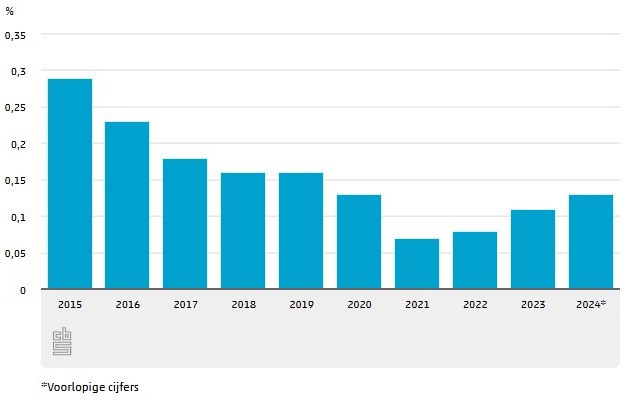 Het aantal faillissementen gecorrigeerd voor het totaal aantal bedrijven (faillissementsgraad) in 2015 was 0,29 procent. Dat betekent dat er per 100.000 bedrijven ruim 290 bedrijven te maken hebben gehad met een of meerdere failliete juridische onderdelen. In de jaren daarna daalde de faillissementsgraad tot 0,07 procent in 2021. In 2024 lag de faillissementsgraad met 0,13 procent op hetzelfde niveau als in 2020.