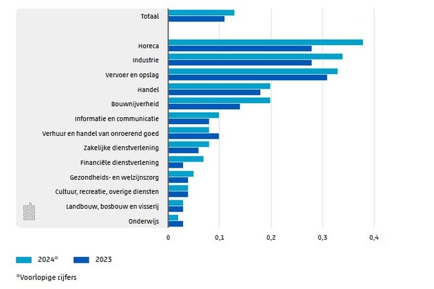 Ten opzichte van het aantal bedrijven zijn in de horeca in 2024 relatief de meeste bedrijven (deels) failliet verklaard. De faillissementsgraad steeg daar van 0,28 procent in 2023 naar 0,38 procent, het hoogst van alle bedrijfstakken. Dat betekent dat per 100.000 horecabedrijven bijna 380 te maken hadden met een of meerdere failliete juridische eenheden in 2024. Ook in de industrie (0,34 procent) en vervoer en opslag (0,33 procent) zijn in 2024 relatief veel (deels) failliet verklaarde bedrijven. In de bouwnijverheid steeg de faillissementsgraad ook relatief sterk, van 0,14 procent in 2023 naar 0,20 procent in 2024. Alleen in de verhuur en handel van onroerend goed en het onderwijs daalde de faillissementsgraad iets. In het onderwijs was de faillissementsgraad ook het laagst.