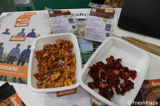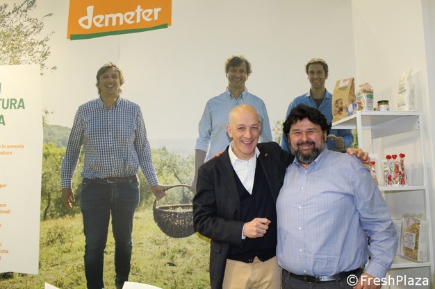 De directeur van Demeter Italia, Giovanni Buccheri, samen met Andrea Ferrarini, sales manager van Bio Ferrarini, tijdens Sana Food 2025