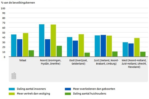 Regionaal was er vooral groei in het meest dichtbevolkte westen en vooral krimp in Noord-Nederland. In 30 procent van de kernen in West-Nederland nam de bevolking af, terwijl dit gold voor 67 procent van de kernen in Noord-Nederland. De bevolkingsontwikkeling in de kernen van Oost-Nederland en Zuid-Nederland lag tussen die van West- en Noord-Nederland in. In Oost-Nederland was in 41 procent van de kernen sprake van bevolkingskrimp, in Zuid-Nederland gold dat voor 44 procent van de kernen.