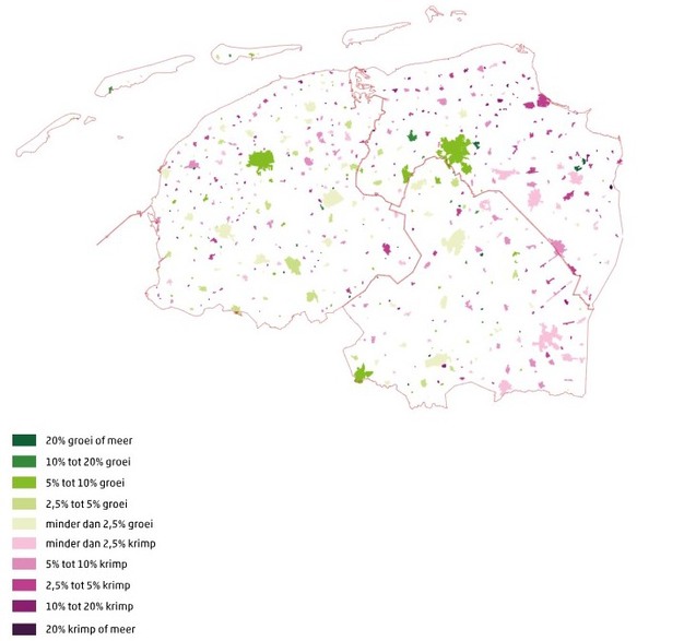 In Fryslân bestonden groei en krimp vaak letterlijk naast elkaar, al is er meer krimp in de noordelijke dan in de zuidelijke helft van de provincie. Ook is er onderscheid tussen stad en land. In de meeste grotere kernen in Friesland groeide de bevolking, terwijl er krimp was in betrekkelijk veel kleinere gemeenten.