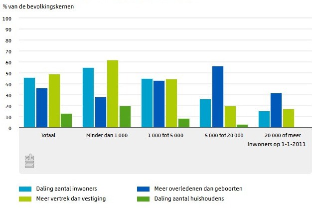 In de kleinste kernen kwam de bevolkingskrimp vooral doordat er meer inwoners vertrokken dan dat nieuwe inwoners zich vestigden. Natuurlijke krimp – er overlijden meer mensen dan er kinderen worden geboren – kwam in deze kleine kernen minder voor. In de grotere kernen met meer dan 5 000 inwoners kwam natuurlijke krimp juist vaker voor dan een negatief saldo van vestiging en vertrek. Door de verdere vergrijzing van de bevolking is te verwachten dat meer bevolkingskernen te maken zullen krijgen met natuurlijke krimp.
